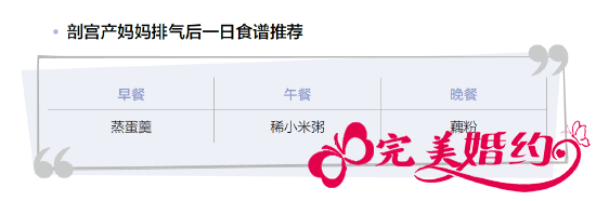 一般来说,剖宫产妈妈术后12~24小时会排气,24小时内不排气需要找医生给予指导,如早下床走动、按摩、药物等。术后6小时可以少量喝点水、萝卜水等来促进肠道蠕动,帮助尽快排气。排气后,可以逐渐进食流食1天,但别进食牛奶、豆浆、浓糖水等容易胀气的食物。情况好转后给予半流食1~2天,再转为普通膳食。