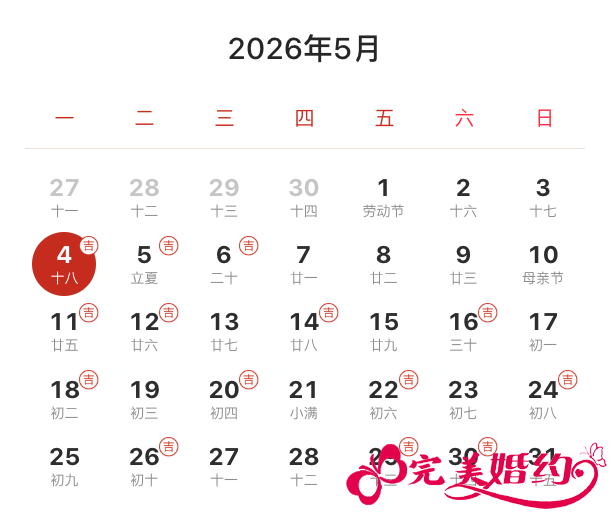 2026年5月结婚吉日共有14天,分别是4日、5日、6日、11日、12日、14日、16日、18日、20日、22日、24日、26日、29日、30日。