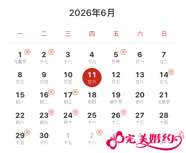 2026年6月结婚吉日共10天,分别是1日、2日、5日、14日、16日、17日、23日、24日、26日、29日。