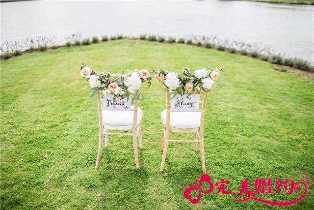 仪式区主要布置的部分有背景墙、宾客座椅、新娘走道。背景墙可选择一个稍高的地势,挂上白色幔布。宾客的座椅需要根据人数来摆放,而新娘走道则需要铺红毯。