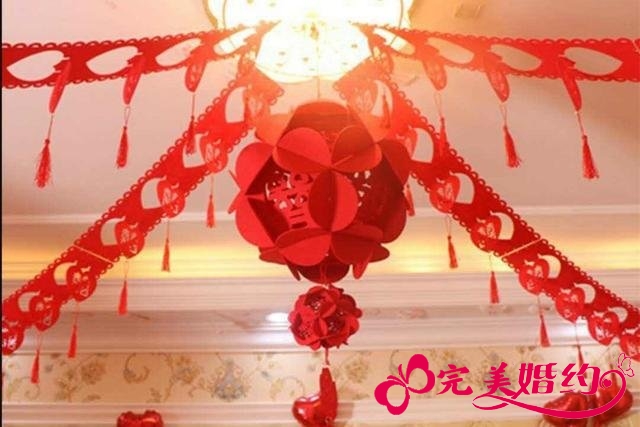 2.拉花本身就是一个充满情调的婚房修饰品。我们可以利用拉花的唯美,再利用仿真玫瑰制作好的大花球挂放在婚房的最中央。营造出一种既美丽又和谐的氛围。
