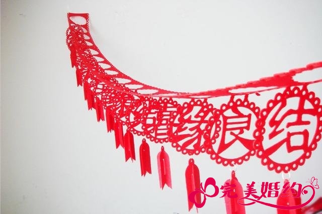 1.用拉花来布置婚房,最主要的是要有吸引大家眼球的闪光点。我们可以用拉花粘满婚房的每一个角落,而拉花中间则制作一个心形的造型。营造出一种飘逸浪漫的婚房气质,而粉紫色的拉花会将你婚房浓浓的情谊散发。