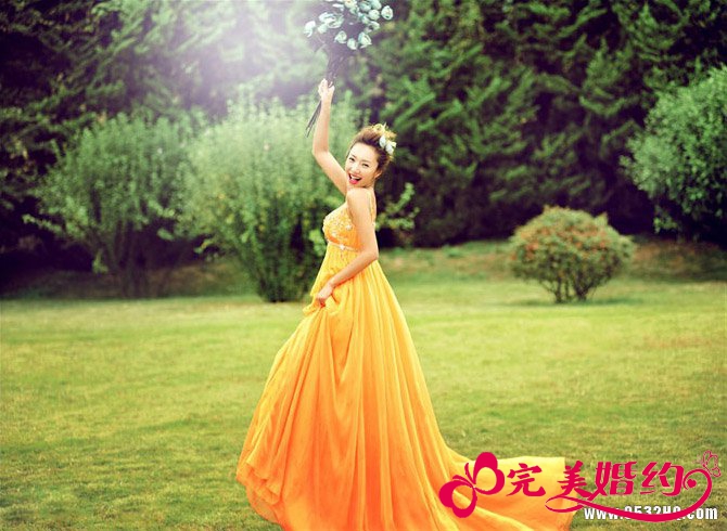 橘黄色系似乎是很少有新娘敢于尝试的,因为这种颜色对新娘的肤色要求较高。万一皮肤不够白皙就会显得不伦不类,从而让皮肤黑的缺点更加突出。所以如果您对自己的肤色足够自信的话,不妨尝试一下这种色系,定会有不一样的视觉盛宴哦。