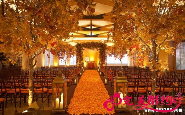 枫叶是秋天最明显的标志了,黄灿灿的枫树随风飘荡,看着缓缓飘落的枫叶心里会有一种舒缓、恬静的感觉。而婚礼不也是这样吗?用橙黄色作为婚礼现场的色调,新人过道上铺满枫叶,不觉得很温馨吗?