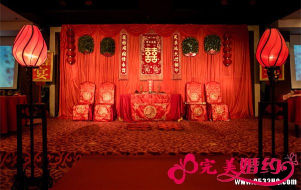 中式婚礼的舞台背景用红色的纱幕做背景,通常都会张贴大幅的红喜字,在婚宴舞台还要设置一个新人拜天的红色的天地桌。