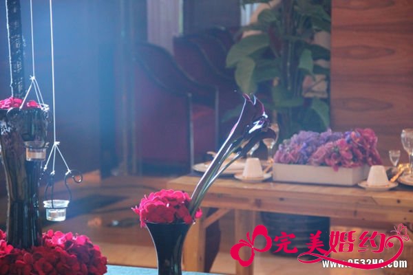由于规模的限制,小型婚礼色彩的选择和搭配就更为重要。一般来讲,热烈的色彩会使空间显得更小,但色彩的选择还是要在场地的条件和来宾人数的前提下来确定。如果你们是在室内办宴会,由于餐厅的面积及层高所限,运用浓烈的色彩会造成一定的视觉压力,最好和策划师商量,大面积使用比较淡的色彩,桌花、装饰物等配件采用鲜艳的颜色。如果是在一块开阔的室外绿地举办宴会,限制就没有那么多,有时采用鲜艳的颜色反而能带来活力和张力,令宴会更出彩。