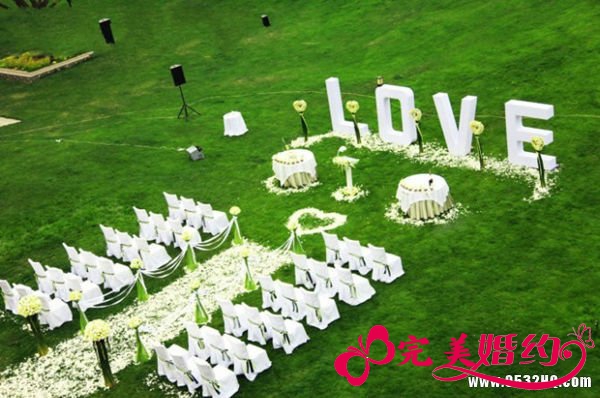 想要突出草坪婚礼的浪漫,场地布置至关重要,清新淡雅的布置会是比较好的选择。看一下国外电影里经常出现的户外草坪婚礼不难发现,这类婚礼装饰的用色往往比较素雅。由于户外绿色占据了整个婚礼的大部分,所以,想要让整个环境变得和谐、高贵,花材就应该选择清淡一点的色彩,如白色、粉色、浅紫色、淡黄色等。需要注意的是,尽量避免大红色的花材,它会破坏高雅的感觉。