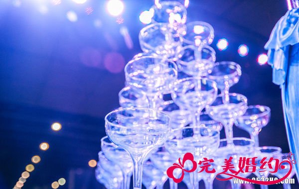 (5)香槟塔摆放的不要过高,应该以新人的身高为标准。如果太高,新人要抬起手倒香槟,感觉很累,而且过高肯定增加倒塌的危险性。香槟塔4---5层最佳。