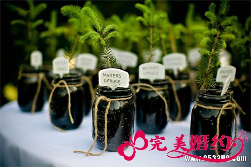 在环保婚礼中,新人们就不要过多用鲜花布置婚礼现场了,不如放些小树苗在瓶子里。树可以净化空气,防止水土流失,举办一场绿色婚礼,让宾客们了解自然的重要性。在婚礼结束后,可以将这些树苗作为回礼送给宾客们,让他们种一棵树,看着它成长。