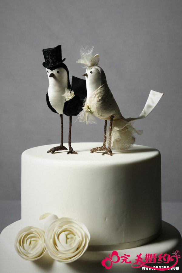 黑白搭配永远是时尚中永不过时的经典,纯洁的白色蛋糕搭配透着白色花朵蕾丝,多了一份甜美,而蛋糕上面的两只小鸟,一个身着白纱,一个身着黑色西服,扮成的新娘新郎扮相,十分可爱,也预示着婚后就如同两只小鸟一样恩爱!