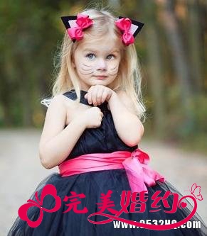 这个小花童的发型虽然呈现着最自然的披散的状态,但是配上一对俏皮的猫耳朵,瞬间将小花童的可爱指数升到了最高点。再在小花童脸上描上几根俏皮的胡须,变身成为了一只可爱的充满灵性的小猫。一只灵动的小猫的现身,一定会让你的婚礼趣味横生。
