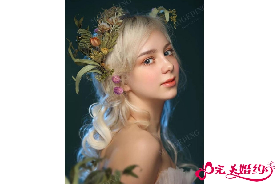 清新的妆容,搭配抽丝造型,配上灵动的花朵,唯美可人。