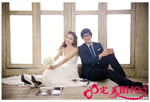 新娘的半身斜靠在新郎身上、肩上或手臂上,展现新娘娇柔和新郎勇于负责的形象。当然,新娘脸上流淌的清纯幸福的表情最为关键。新郎的表情欣喜或严肃均可。