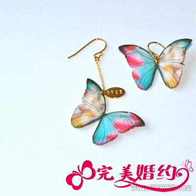 渐变色的彩蝶耳饰像专为春天而生,让人看了不禁爱怜有加。新娘佩戴这款耳饰,更添妩媚和柔情,在户外上演一场浪漫之恋。