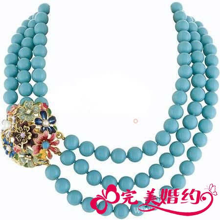 抹胸婚纱应该佩戴豪华的镶有钻石、红宝石、祖母绿、蓝宝石、翡翠、猫眼石等珠宝的羽式项链或珍珠项链。