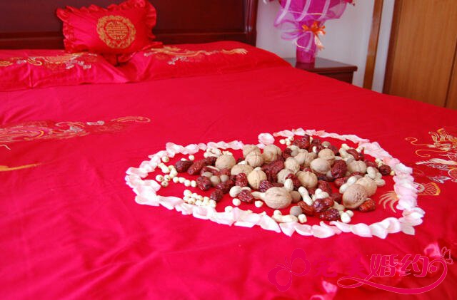 铺婚床的物品主要指的是结婚被子、结婚褥子、结婚枕头等床上用品(床上用品要成双成对)和蜜枣、花生、桂圆、莲子等象征“早生贵子”寓意的干果。