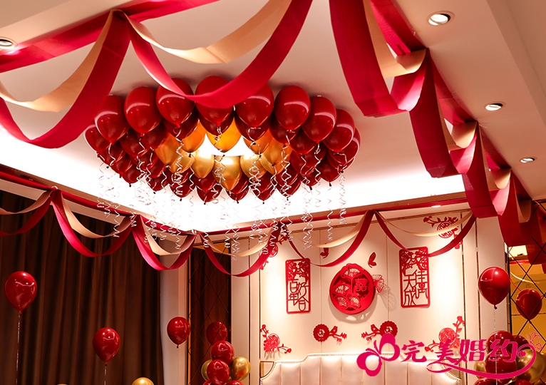 如果新人选择的是纸质拉花或塑料拉花,可以用胶带按照造型粘贴在墙上,这种方法适合短期装饰,婚礼结束后去掉即可,但这种方法可能会将墙面的漆粘掉,比较适合贴墙纸的房子。