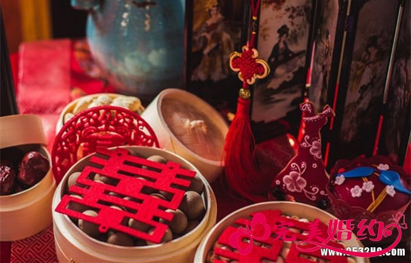 2、四色糖:桔饼、冬瓜糖、冰糖、糖果,象征甜甜蜜蜜,白头偕老,无限幸福之意。