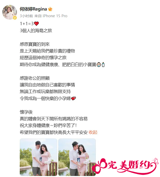 2024年12月在社交平台宣布怀孕,并发文:“感恩宝宝的到来,是上天赐给我们最珍贵的礼物”。